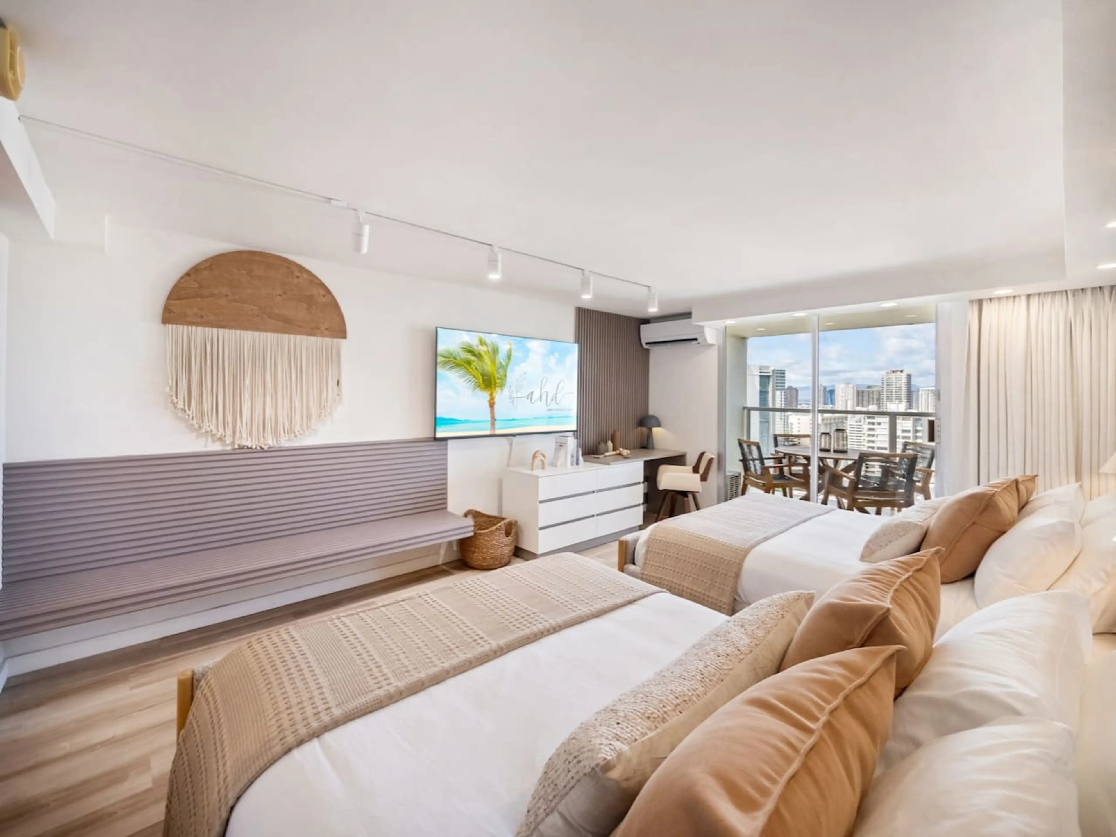 Aloha and welcome to our beautifully renovated 35th-floor studio. Enjoy sweeping 180° views (cityscape, canal, partial ocean) from your private lanai! Renovated Oct 2025 with brand-new furnishings for ultimate comfort. Unparalleled location: steps from the vibrant Waikiki Strip, International Marke...