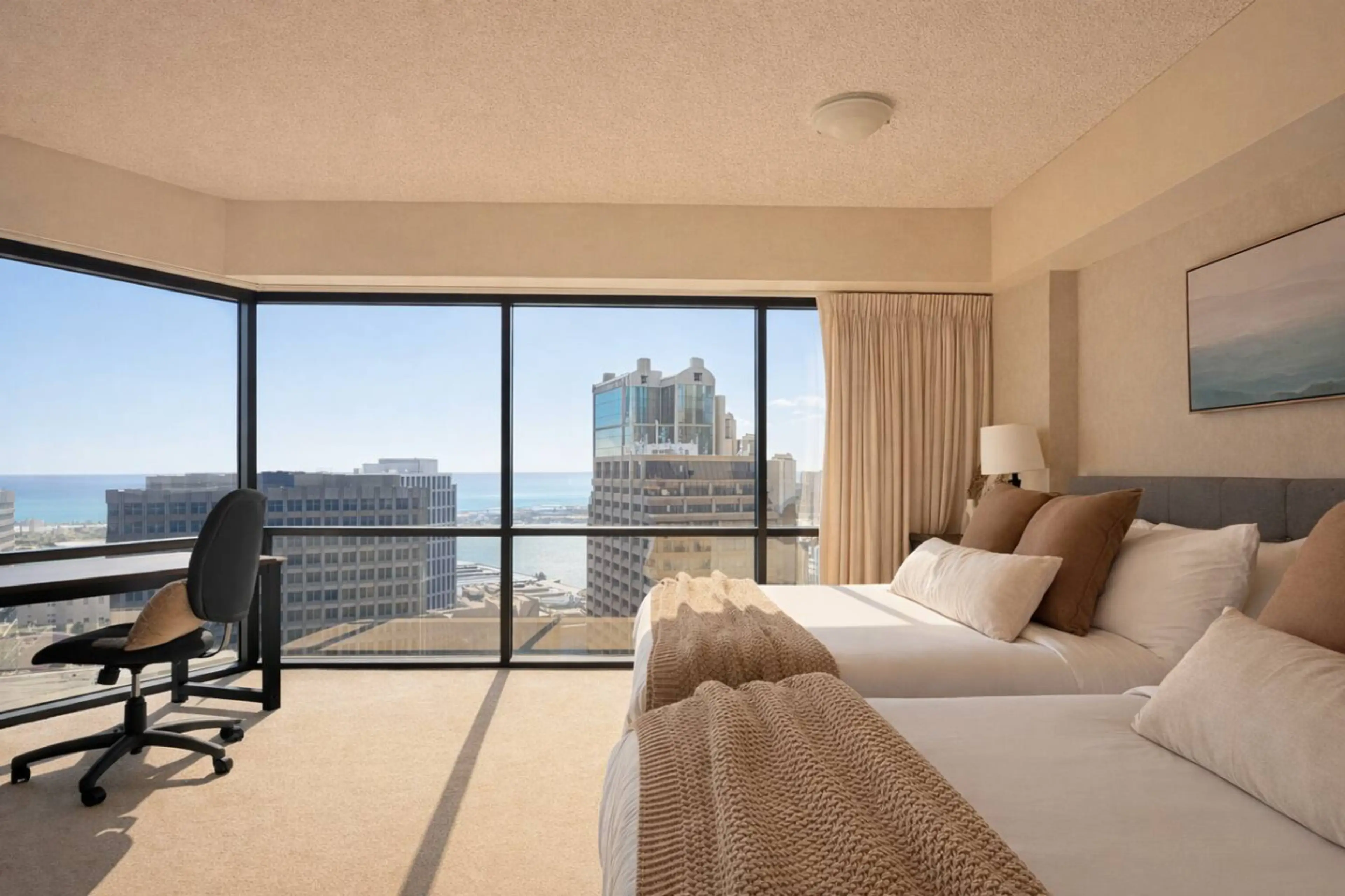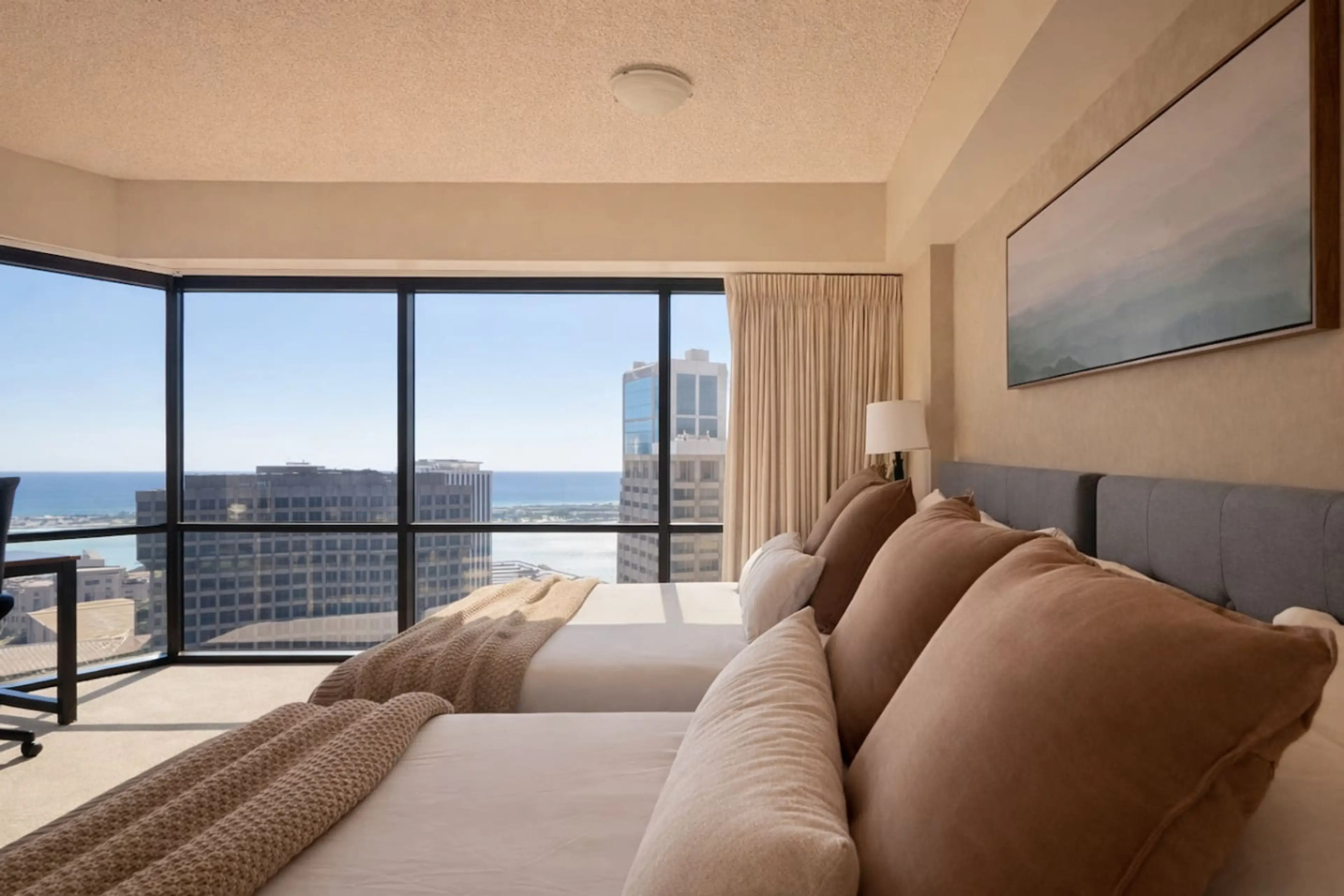 Enjoy a relaxing stay in the heart of downtown Honolulu at our Executive Centre condo, steps from dining, shopping, and business hubs. This inviting space offers ocean views, two full beds, and a cozy living area with kitchenette. Stay connected with free Wi-Fi and cool with central AC. Guests enjoy...