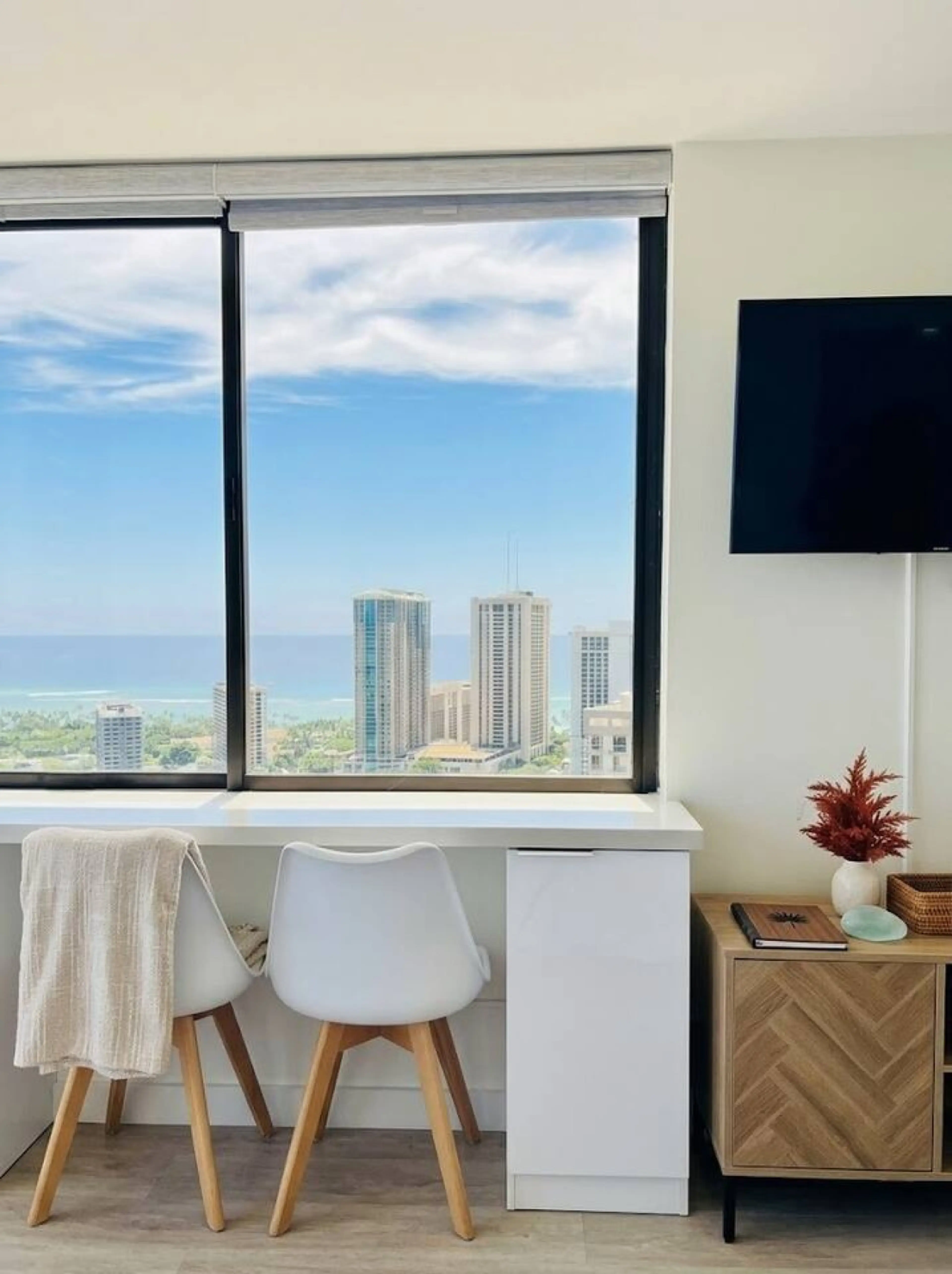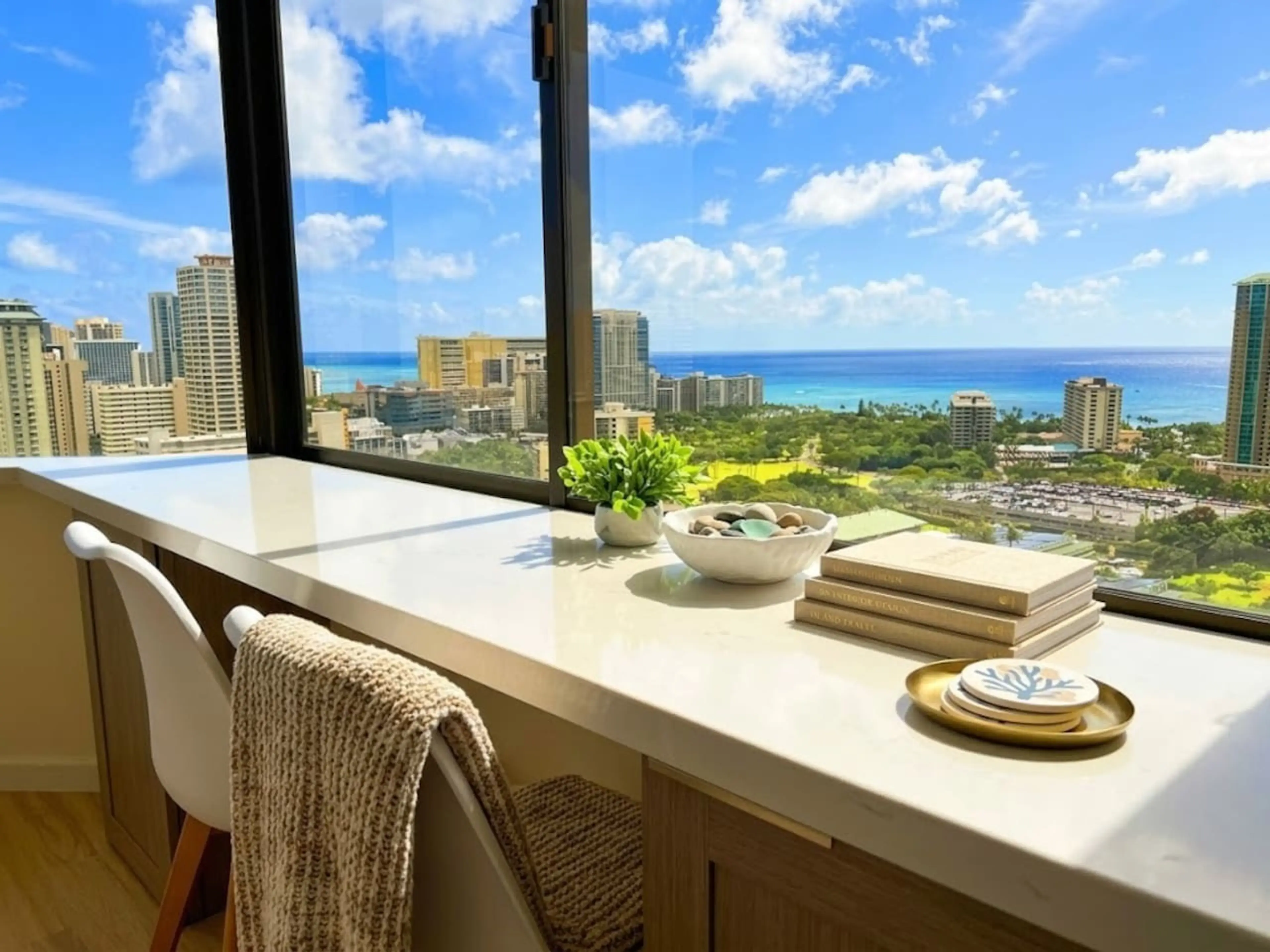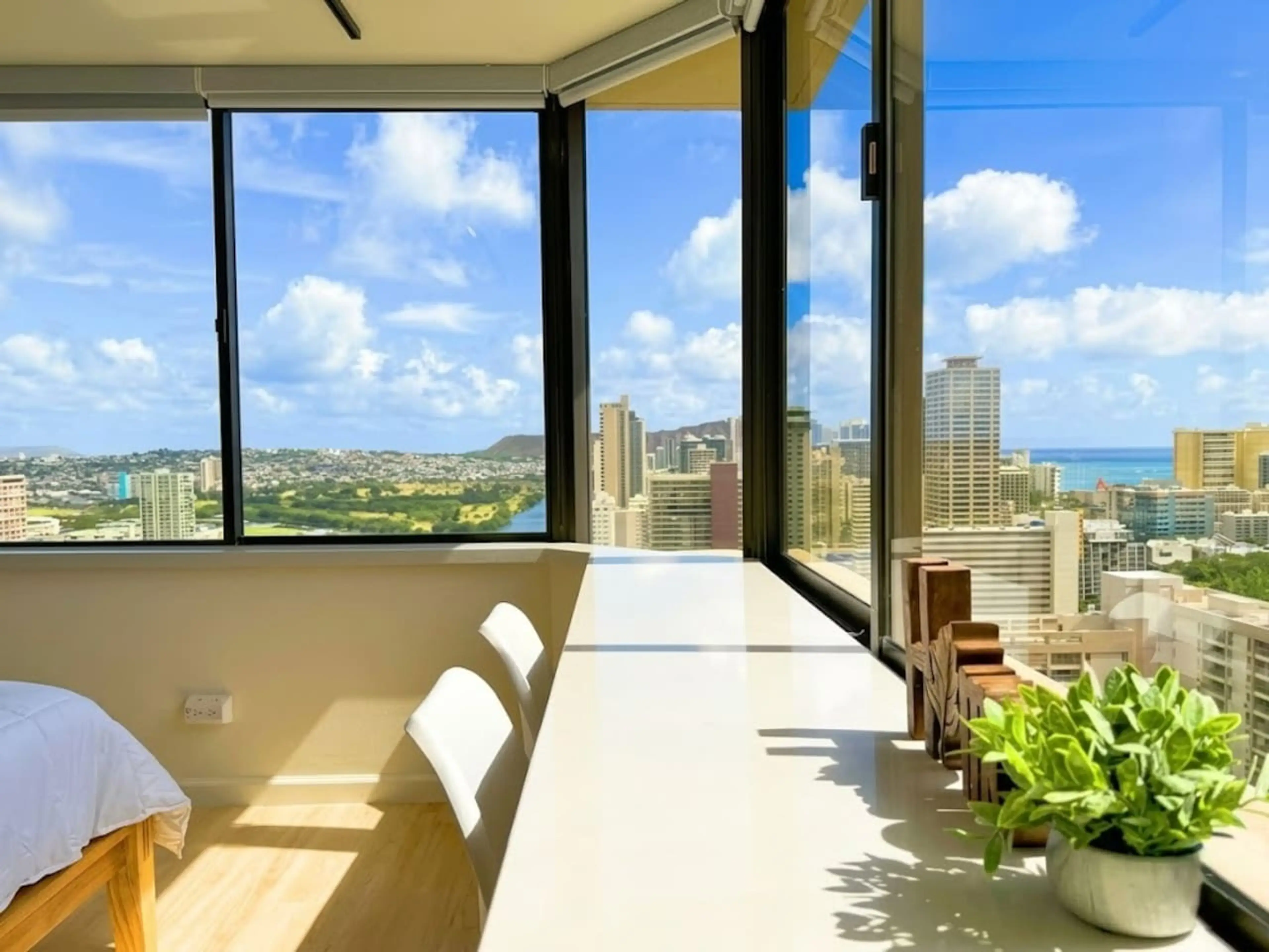 At the beginning of Waikiki, the tourist center of Honolulu. Our charming studio in Waikiki is a breezy unit in Hawaiian Monarch building. Enjoy breathtaking Ocean & Mountain views. Hotel quality sheets, pillows, and air conditioning await you. Excellent location right across the convention center...
