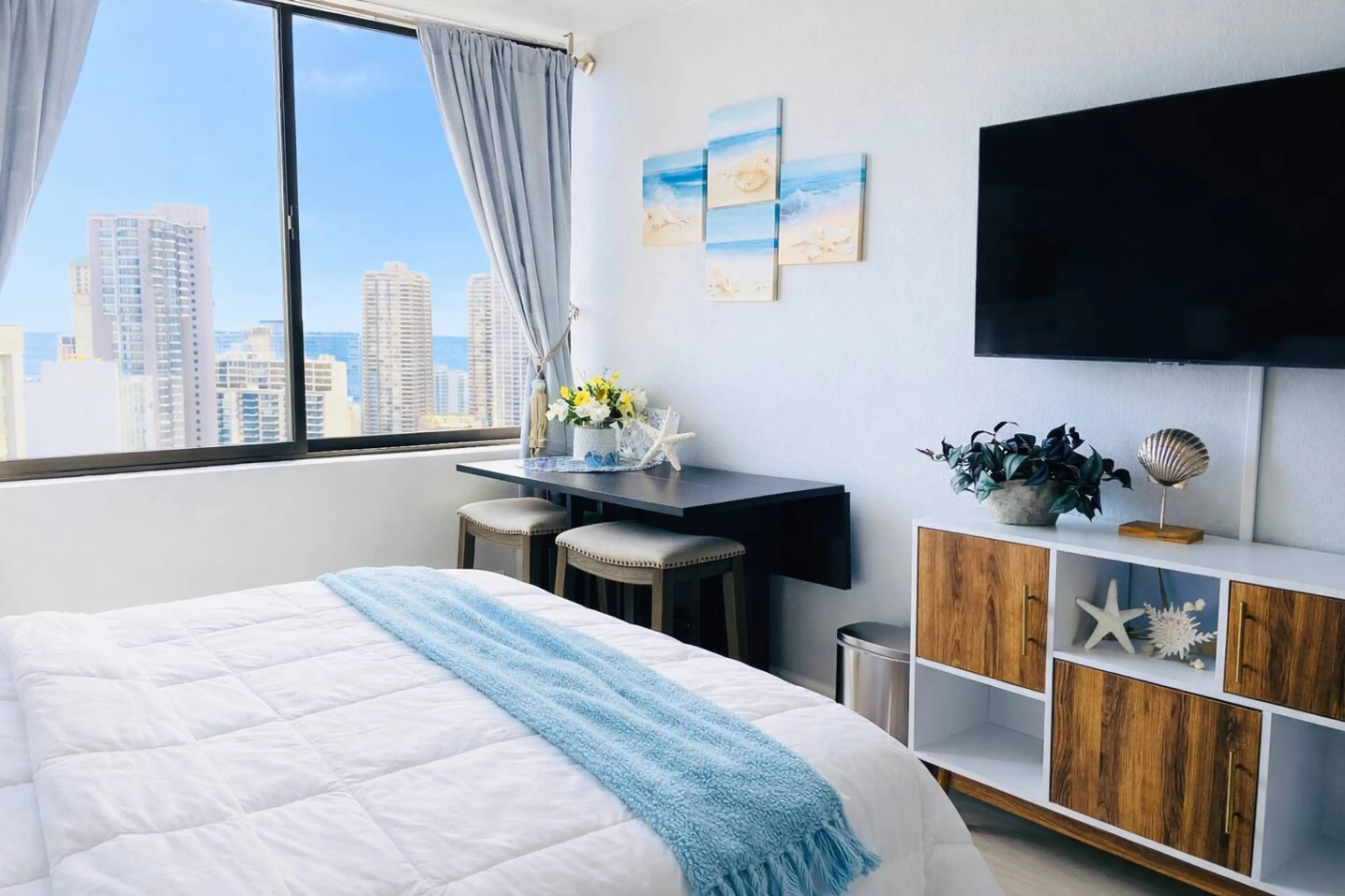 At the beginning of Waikiki, the tourist center of Honolulu. Our charming studio in Waikiki is a breezy unit in Hawaiian Monarch building Enjoy breathtaking Mountain View. Hotel quality sheets, pillows, and air conditioning await you. Excellent location right across from the convention center, abo...