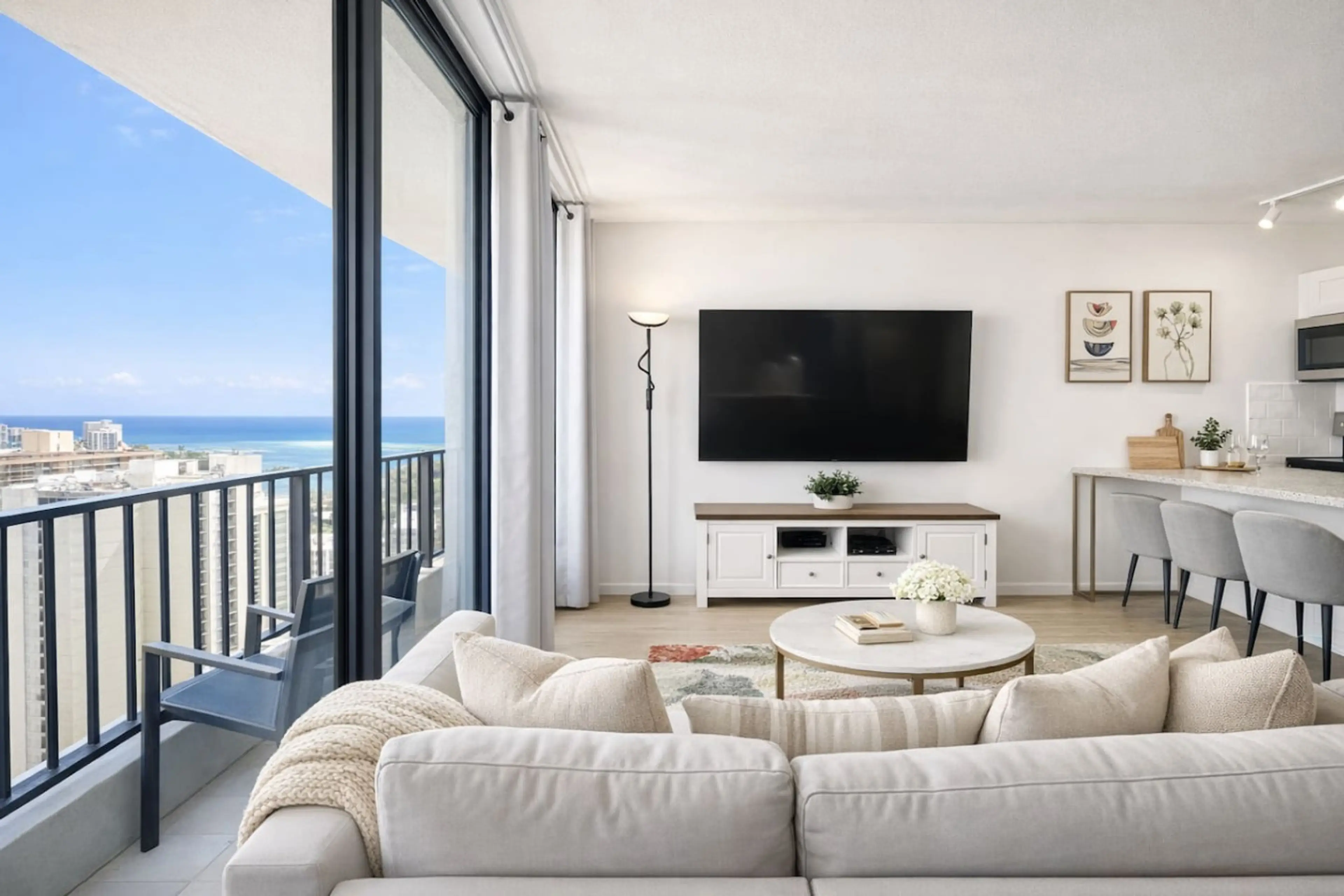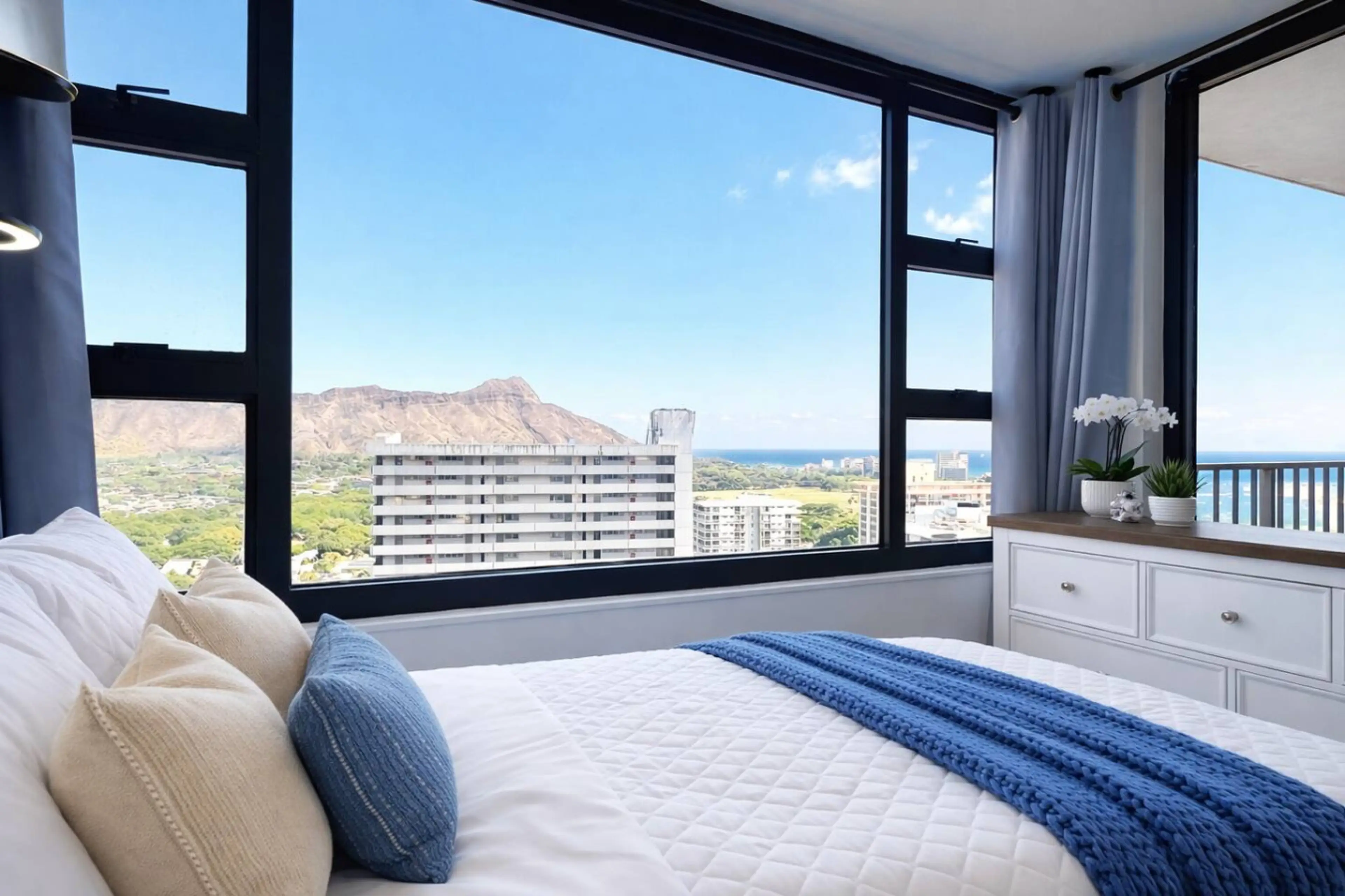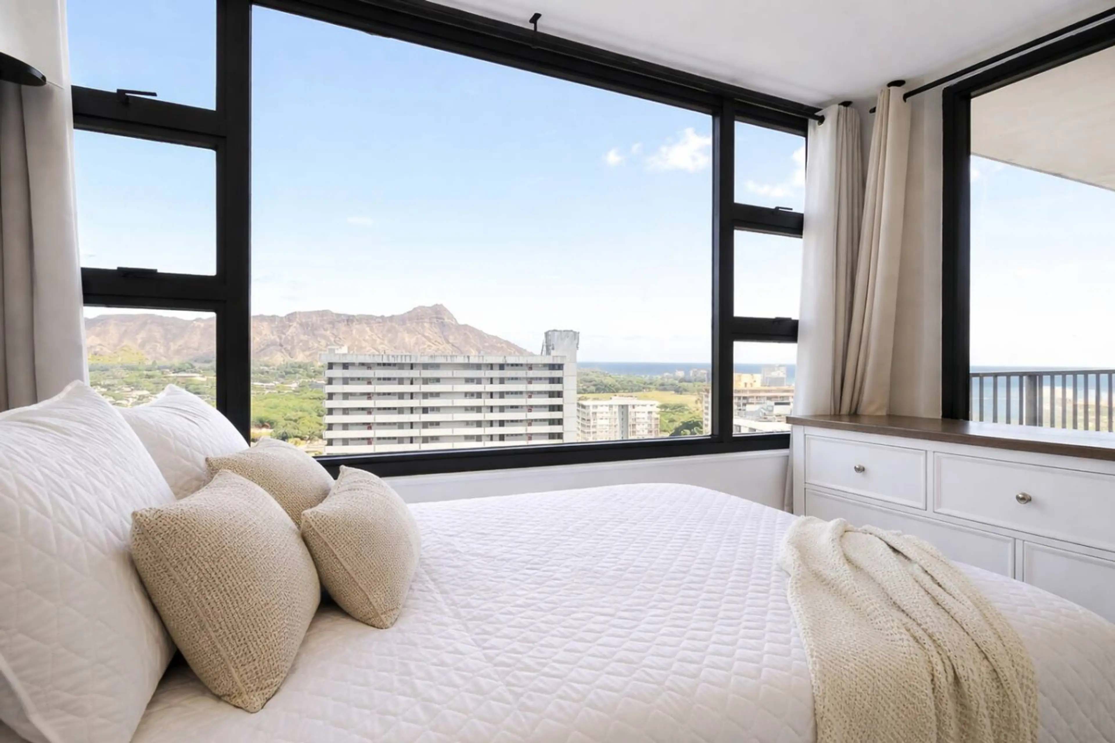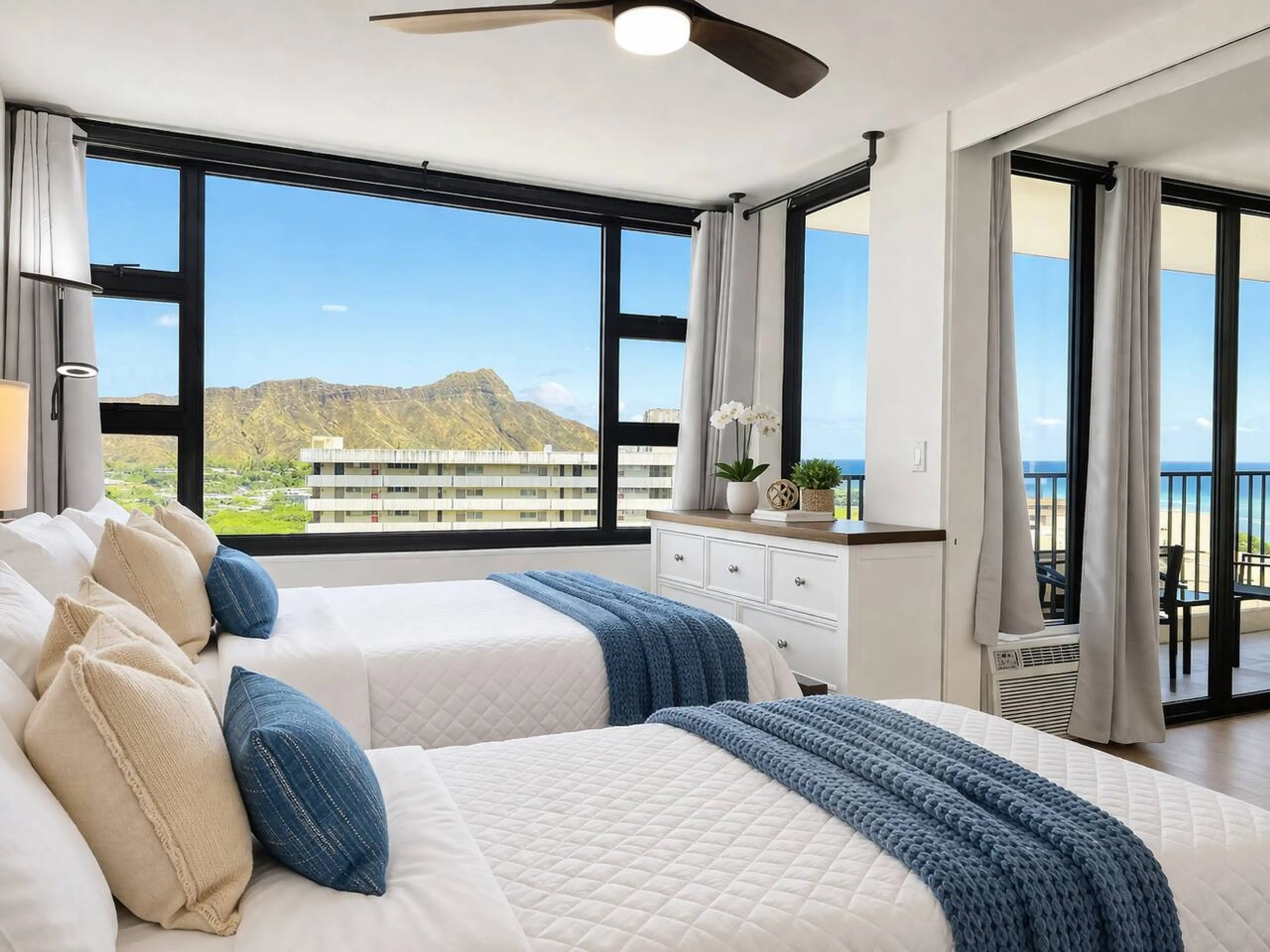 Aloha! Enjoy this newly renovated, modern stylish 1 bedroom/1 bath suite, just steps away from World Famous Waikiki Beach with Diamond Head and Ocean views on the 27th floor of Waikiki Banyan. The suit has 2 Queen beds in the bedroom, a sofa bed in the living room, and a Full kitchen. It is also fa...