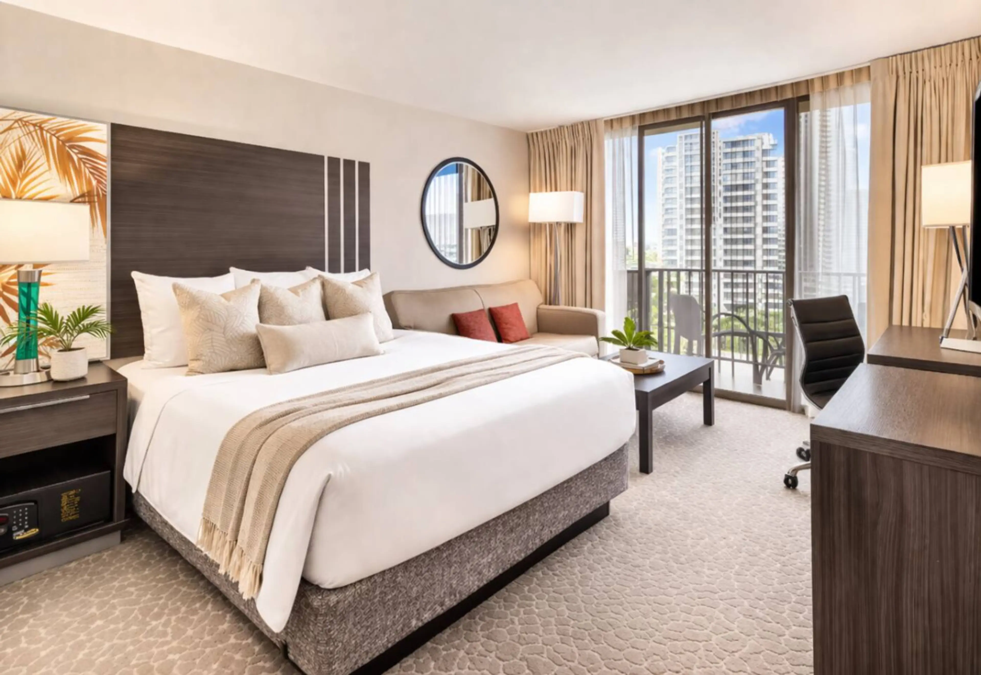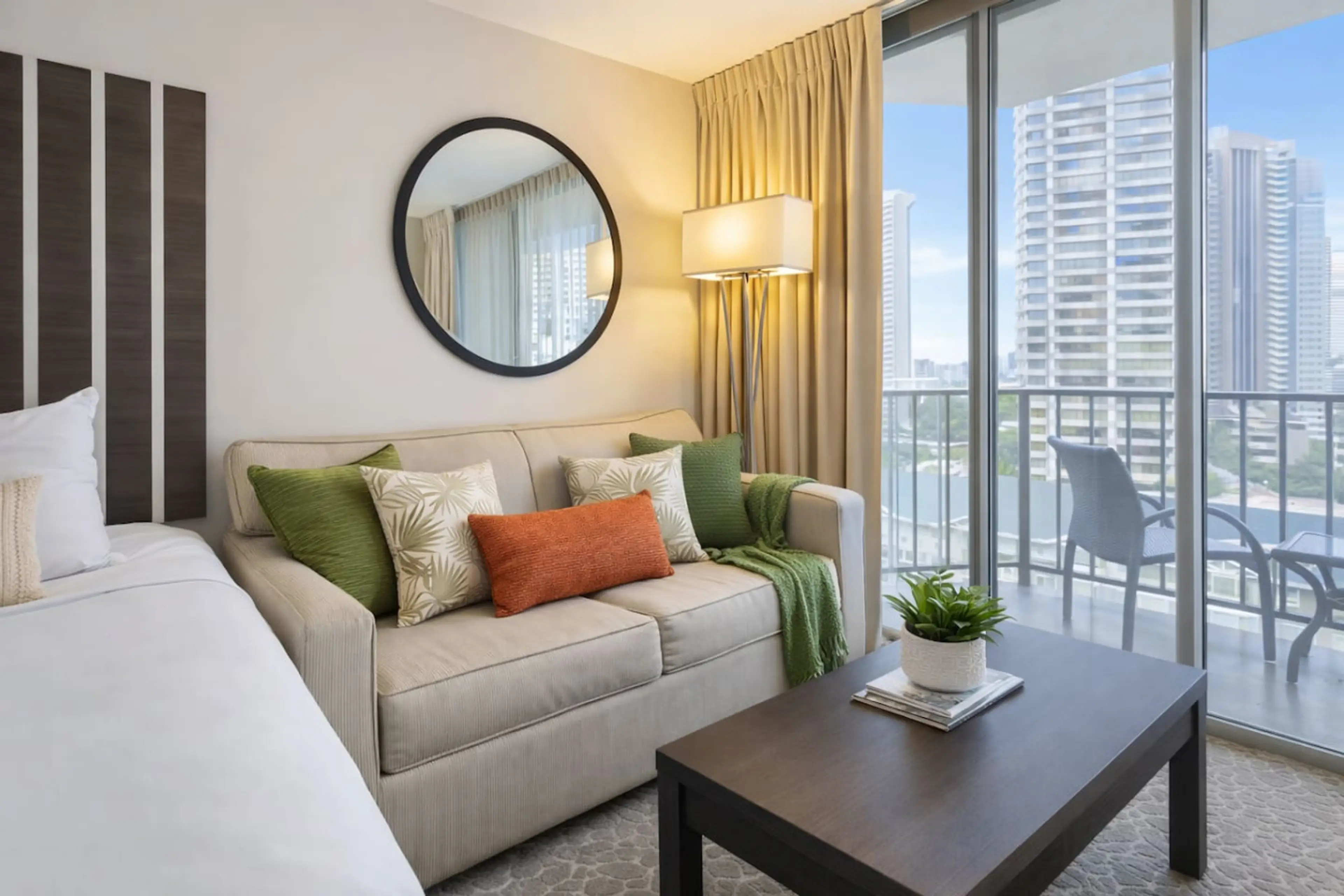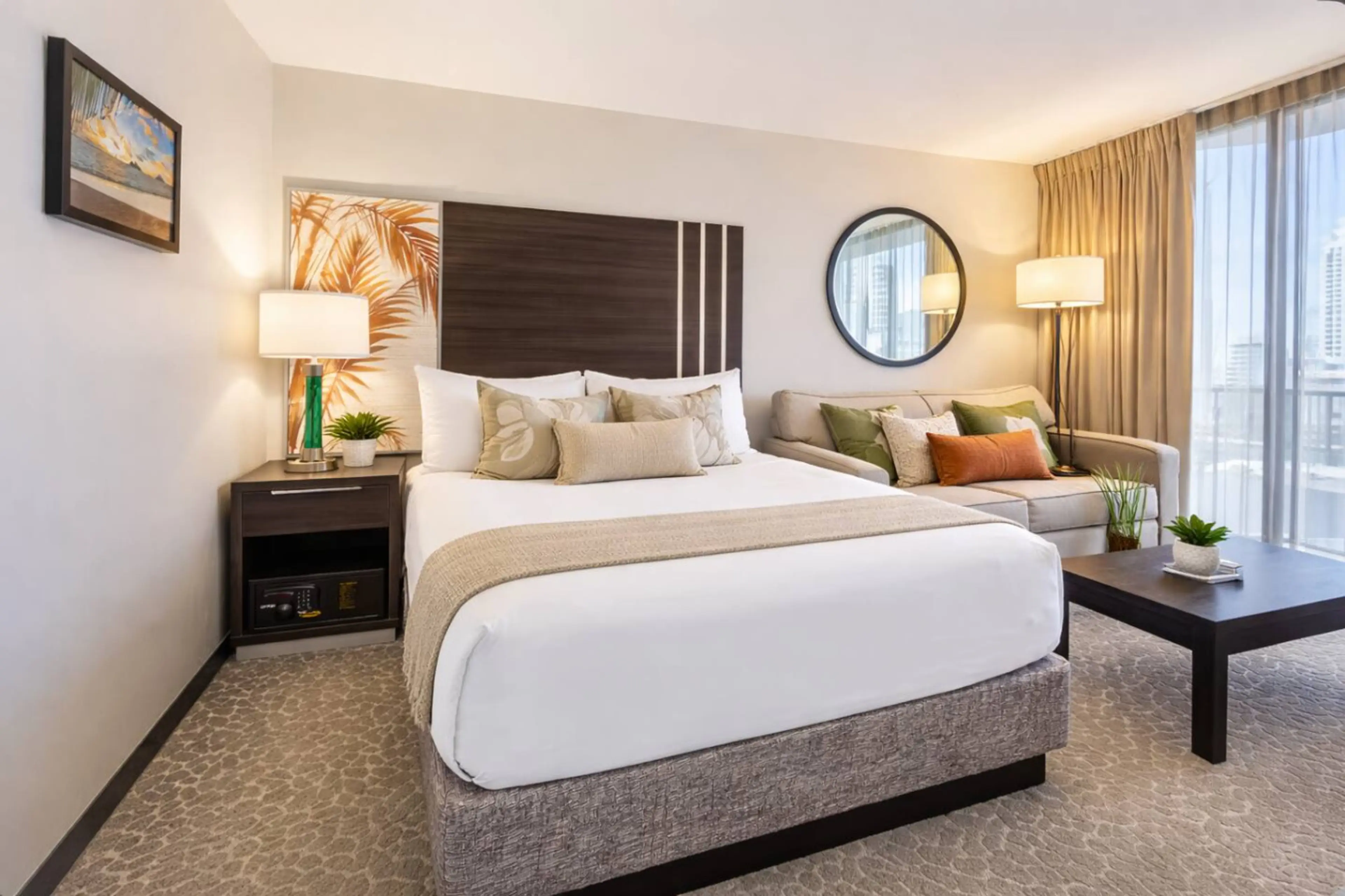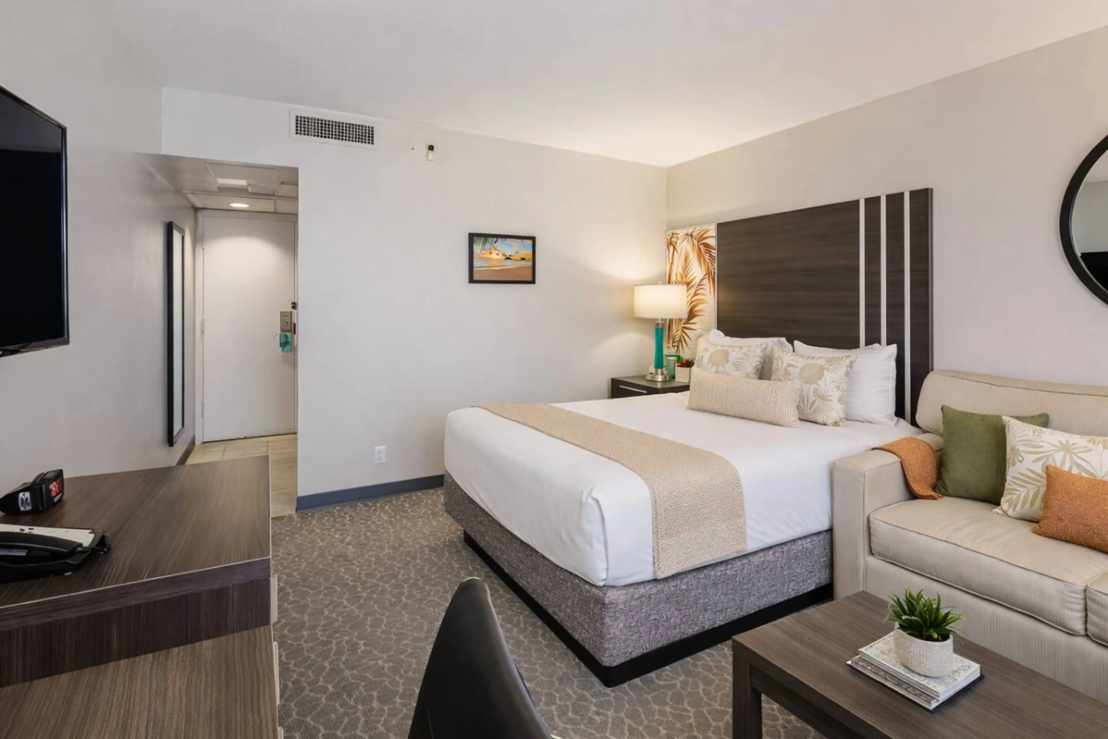 Stay at the Aqua Palms Hotel, centrally located on the Waikiki Strip just a 5-min walk to the beach. This fully renovated 2020 unit offers a comfy Queen bed plus Queen sofa bed, private lanai, and breakfast nook with microwave, fridge, coffee maker, and dinnerware for 4. Enjoy free access to the poo...