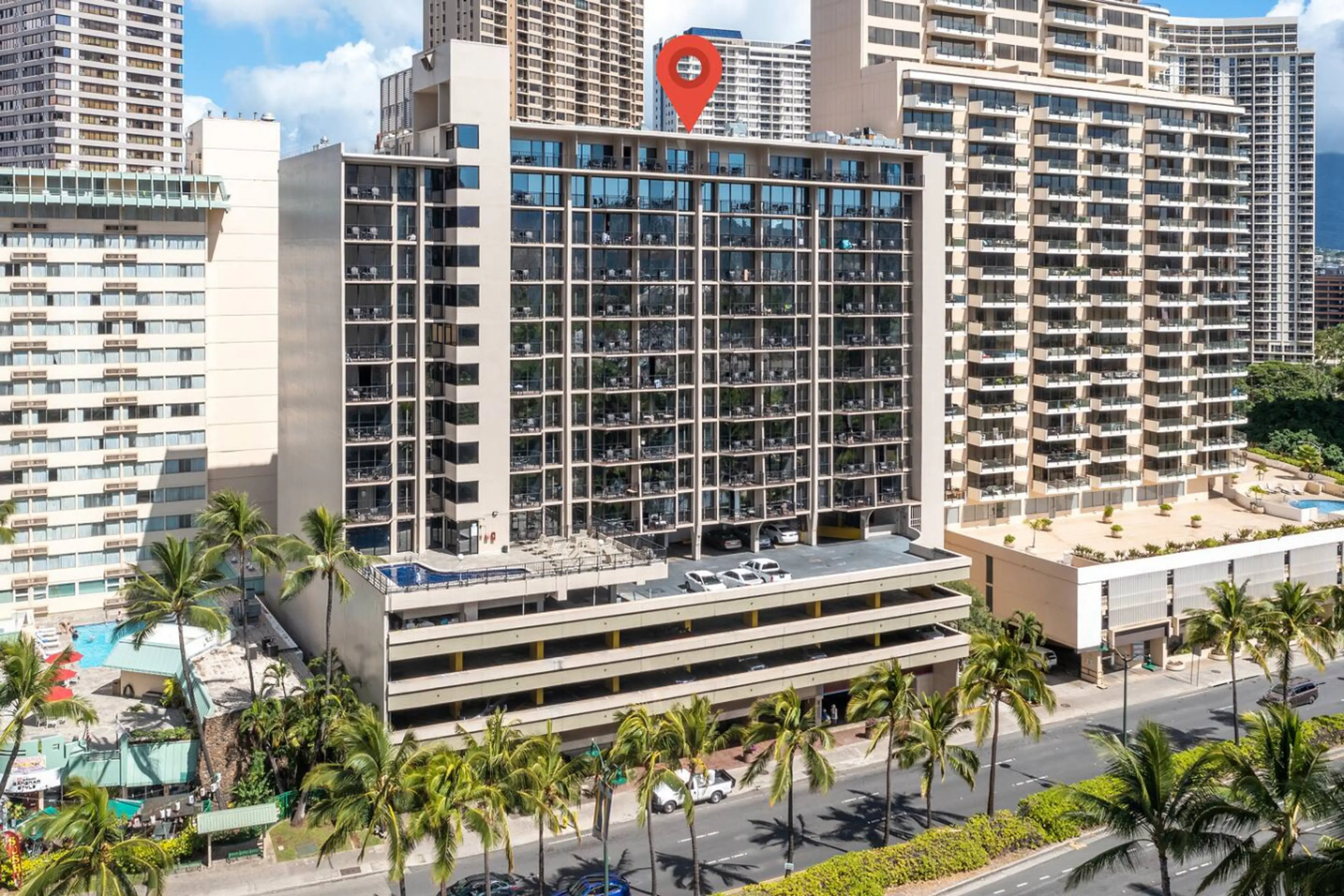 Right across to Hilton Village. Fireworks every Friday 7:45pm. Centrally-located on the Waikiki Strip in Aqua Palms Hotel. Take a walk to the beach about 5 min, minutes away to Ala Moana, and many restaurants. Thoughtfully furnished and decorated for comfortable Hawaiian, modern style living. 3-mi...